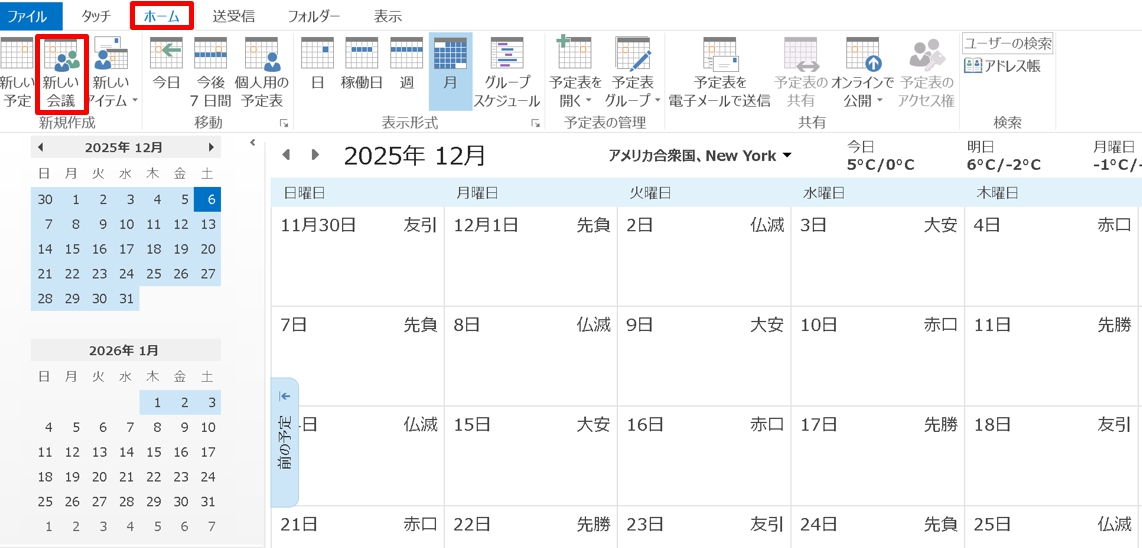2.Outlookの「予定表」に切り替わるので、「ホーム」タブをクリックして、「新規作成」グループにある「新しい会議」をクリックします。