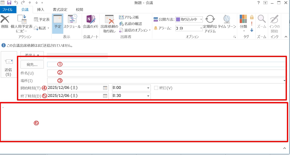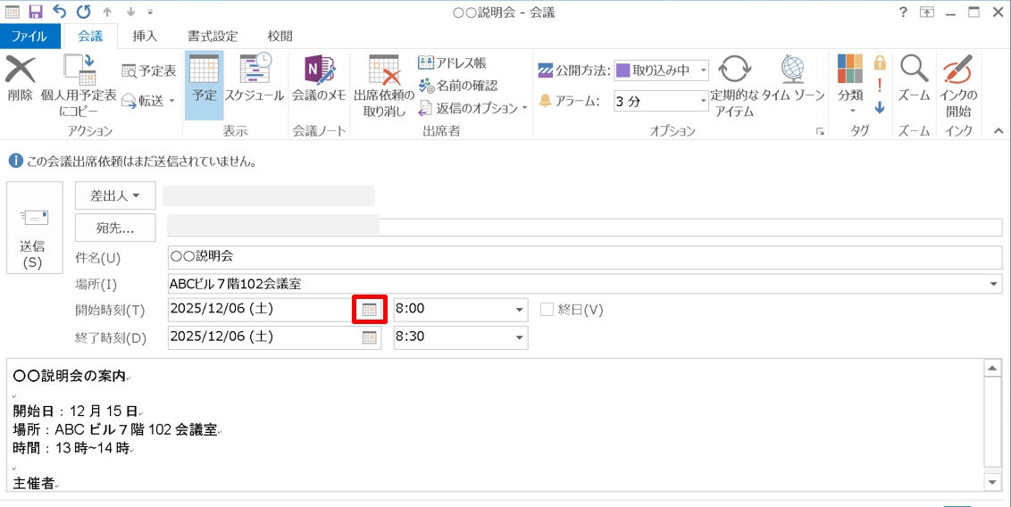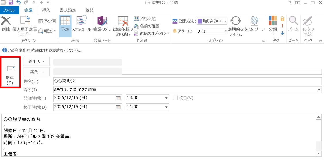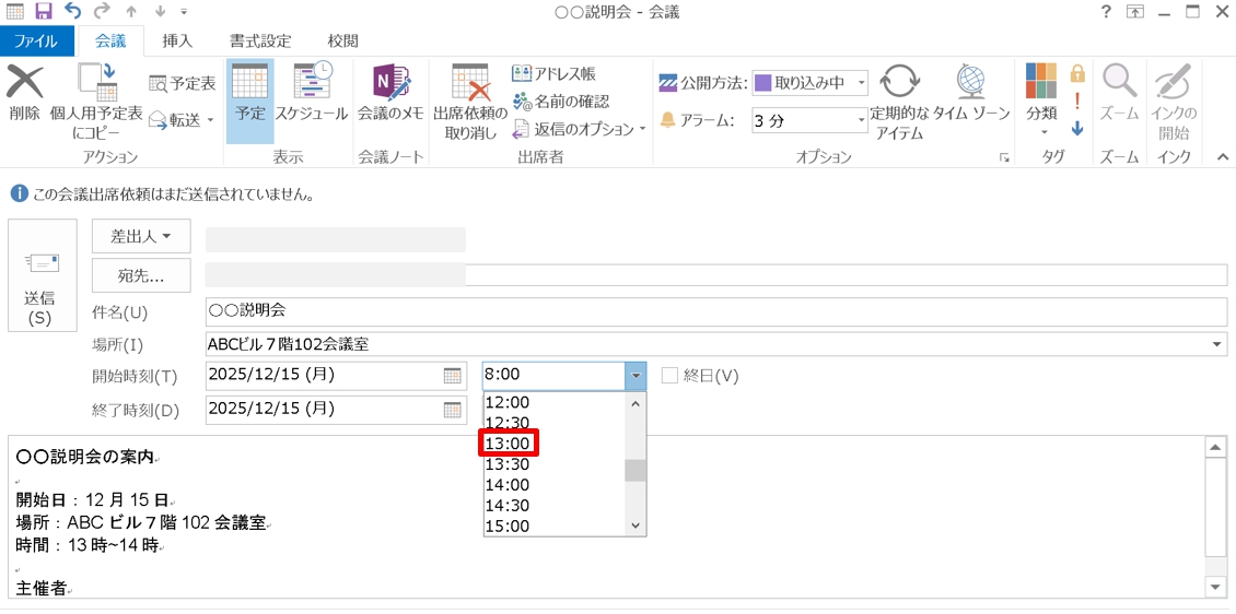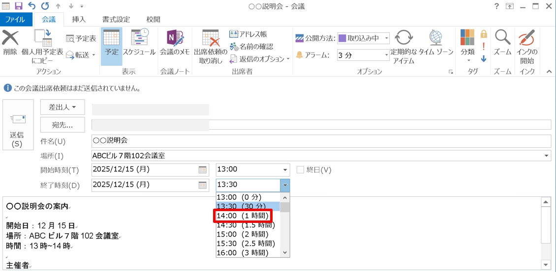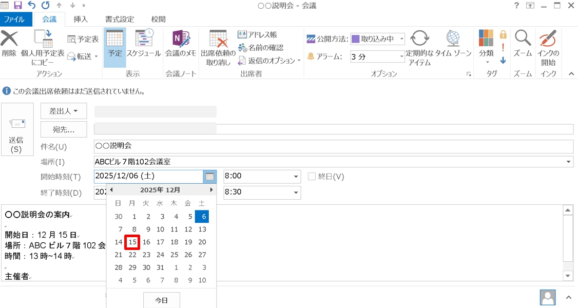 Outlookの予定表で会議室の予約を設定し、会議出席者に依頼メールを送信してみましょう。