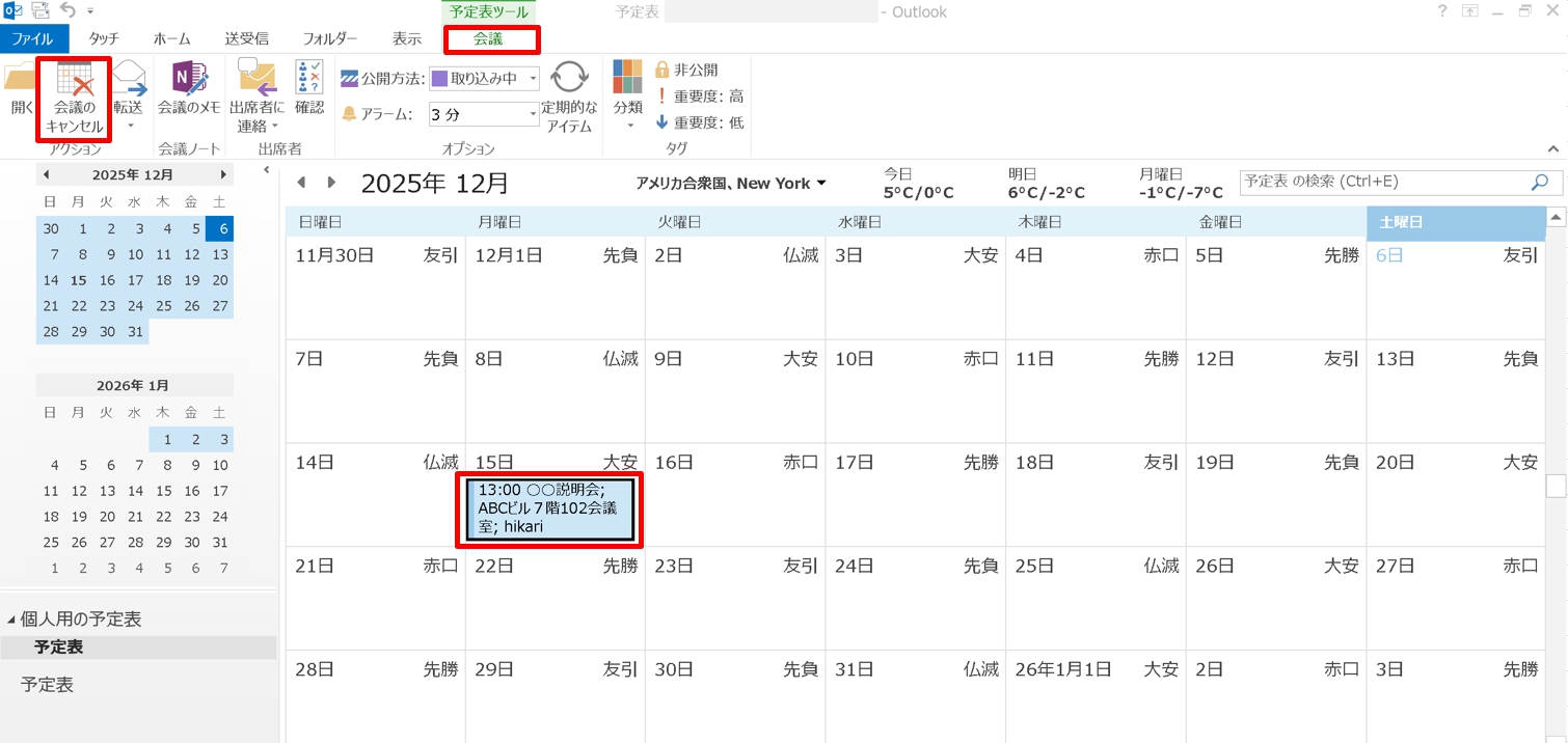1.Outlookの「予定表」には、予約した会議が「12月15日」に設定されています。「12月15日」に表示されている「会議」を選択します。